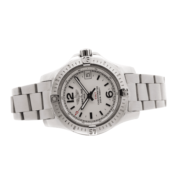 Crafted in stainless steel with a 33mm case, the Breitling Colt Stratus delivers both durability and refined wearability. Its silver dial glows with understated charm, featuring luminous markers and hands that ensure legibility in any light. Beneath the surface, a Swiss quartz movement guarantees precision timekeeping — a hallmark of Breitling’s engineering mastery. The solid steel bracelet provides a secure, comfortable fit, while the design’s clean lines and polished surfaces offer a quiet nod to the brand’s aviation heritage.