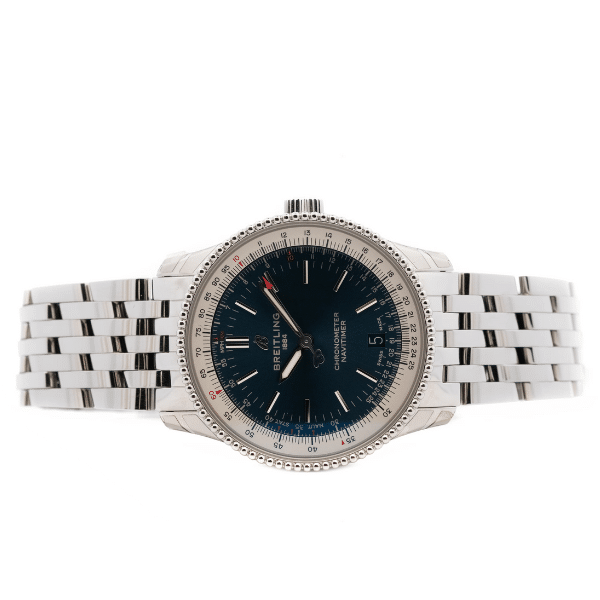 The blue dial reinforces its aviation roots, offering depth and clarity without overwhelming the design. Traditional Navitimer detailing remains intact, now enhanced by a simplified layout with a practical date function. Protected by a scratch-resistant sapphire crystal, the dial maintains crisp legibility and durability, making it ideal for everyday wear. The solid stainless steel bracelet adds confidence to the wrist, reinforcing the watch’s tool-watch credibility while elevating its luxury feel.