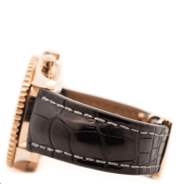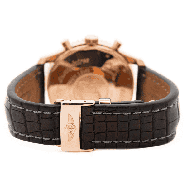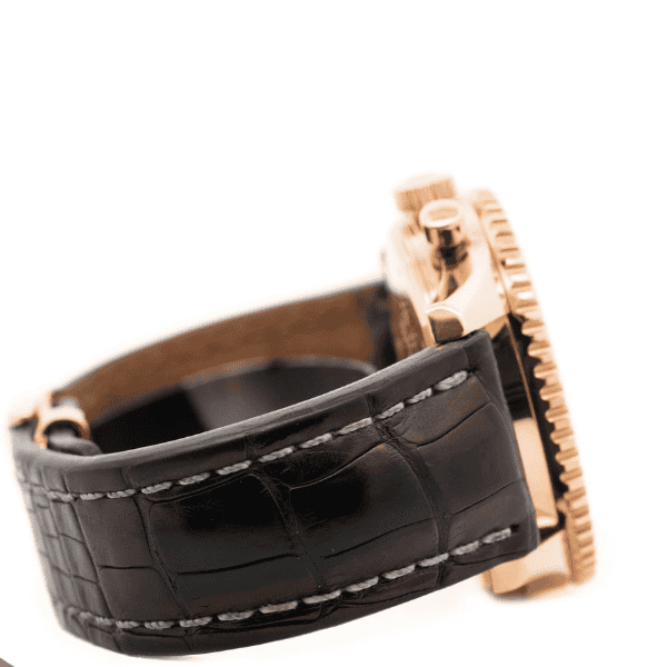Inside, the watch is powered by Breitling’s automatic chronometer-certified movement, ensuring accuracy worthy of the Navitimer name. The piece is paired with a rich brown leather strap and an 18K rose-gold folding clasp, completing its warm, luxurious aesthetic.