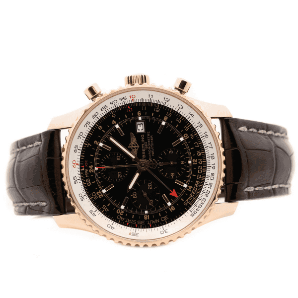 This pre-owned Breitling Navitimer World R24322, offered in mint / like-new condition, showcases a robust 46mm rose-gold case, matching gold pushers, a screw-down crown, and the brand’s signature bidirectional slide-rule bezel, a tool long used by pilots for real in-flight calculations. The deep black dial provides the perfect backdrop for gold-outlined luminescent hands, a red-tipped chronograph seconds hand, and a red GMT hand for tracking a second time zone—a feature that appeals directly to globetrotters and aviation purists. A discreet date window at 3 o’clock enhances practicality without breaking the symmetry of the chronograph layout.