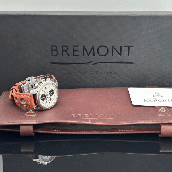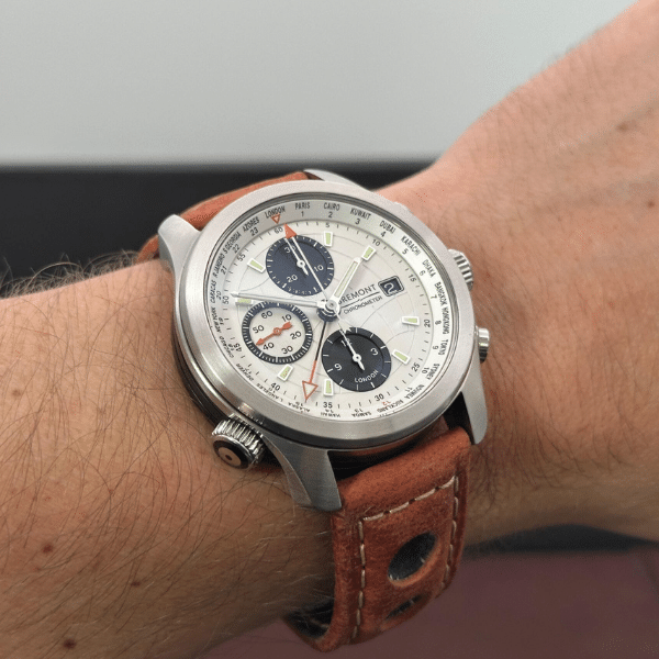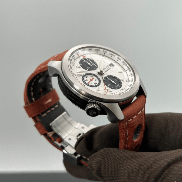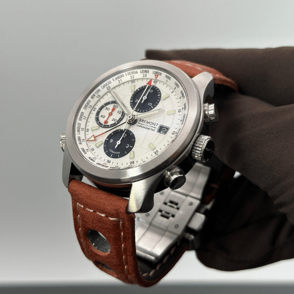 Powering the watch is an automatic movement with two highly useful complications: a chronograph for precise timing and a world timer function for tracking multiple time zones. Together, they make this watch exceptionally versatile for daily life, travel, and professional use. The crisp white dial offers excellent legibility, complemented by clear sub-dials, a practical date display, and intuitive controls that reflect Bremont’s pilot-focused design philosophy.