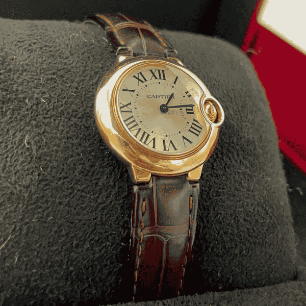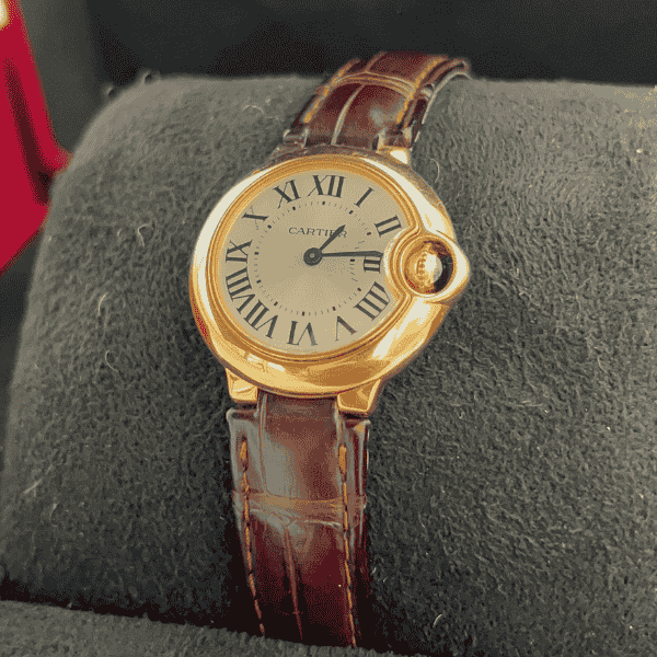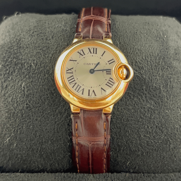 Powered by a precise quartz movement, the Ballon Bleu delivers accuracy with minimal maintenance, perfect for busy professionals who demand reliability. The watch is complemented by a rich brown leather strap, secured with a classic Cartier ardillon buckle for secure, comfortable daily wear.