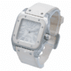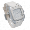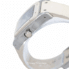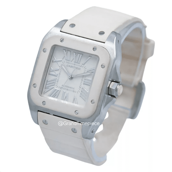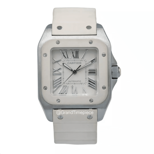 This pre-owned Cartier Santos 100 features a 33mm x 44mm stainless steel case, designed to command attention without overwhelming the wrist. The standout feature is the cream rubber bezel inlay, echoing the matching cream rubber strap, which adds a sporty modernity to the watch’s otherwise refined aesthetic. The ivory dial, adorned with Cartier’s signature Roman numerals and luminescent hands, ensures both timeless appeal and practical legibility.