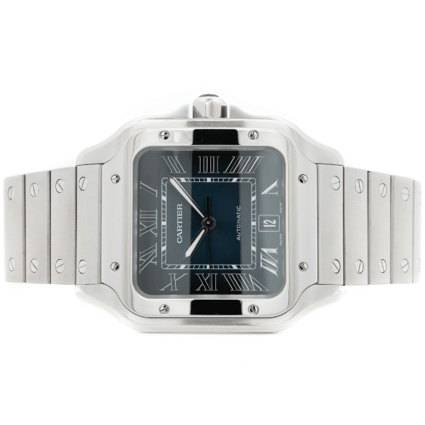 The Cartier Santos De Cartier WSSA0030 features a 39.8mm stainless steel case with Cartier’s unmistakable square profile and exposed screw aesthetic, a design born from aviation history and elevated into modern luxury. Its graduated blue dial adds depth and sophistication, complemented by steel sword-shaped hands and protected by a sapphire crystal. The seven-sided crown, set with a faceted synthetic spinel, is a signature Cartier detail that reinforces its jewellery-watch crossover appeal.