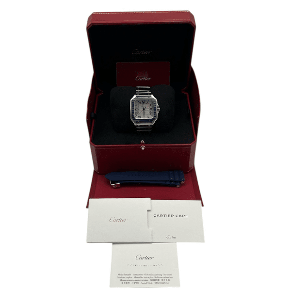 Powering the watch is the Cartier Manufacture Calibre 1847 MC automatic movement, known for its reliability, efficiency, and everyday robustness. Protected by a sapphire crystal and water-resistant to 100 metres, this Santos is as practical as it is elegant—perfectly suited to both daily wear and formal occasions.