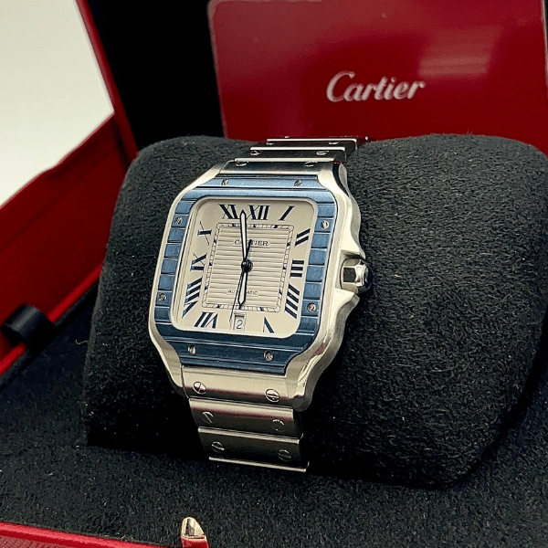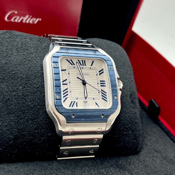 This large-model Santos features a 39.8mm stainless steel case accented by a distinctive blue PVD bezel, offering a subtle yet striking contrast against the grey striated dial. Sword-shaped steel hands and applied hour markers, all treated with luminescent material, ensure clarity while reinforcing Cartier’s unmistakable design language. The signature blue synthetic spinel crown adds a refined finishing touch that jewellery-minded buyers will instantly appreciate.