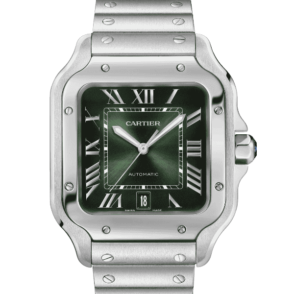 The 39.8mm steel case houses Cartier’s self-winding 1847 MC movement, known for its reliability and refined engineering. Its distinctive graduated green dial offers a fresh take on the classic Santos aesthetic, while the polished steel sword-shaped hands, filled with luminescent material, ensure legibility in any light. The watch’s steel bracelet features Cartier’s SmartLink system, allowing effortless sizing adjustments without tools, while the QuickSwitch mechanism makes it simple to change straps for different looks. The blue spinel-tipped 7-sided crown is a signature Cartier flourish, adding a subtle touch of luxury.