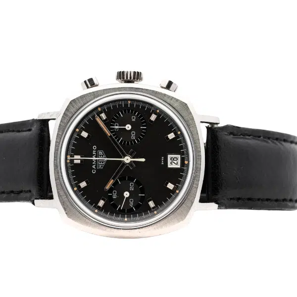 For the serious collector, the Heuer Camaro checks all boxes by merit of its specifications alone. Yet for the modern enthusiast, this watch offers a contemporary flare that many vintage pieces do not. Criticisms of the Carrera arise through its modest 36mm diameter- while only 1mm larger, the Camaro’s square shape commands a greater, fleshed-out presence on the wrist. Sharing similar dials, hands and movements, the Camaro had all the simplicity of its predecessor, the Carrera. However, the Camaro’s major difference lies in its cushion-shaped case, boasting a polished grind on its concave sides to offer a grittier modern character. Much as the Camaro automobile was Chevrolet’s response to the wildly popular Ford Mustang, the Heuer Camaro offered a dynamic new spin on its elder sister. However, while the Chevy Camaro’s star would continue to rise, the Camaro wristwatch would be discontinued after only 4 years in 1972, eclipsed by Heuer’s bold new line of automatic chronographs.