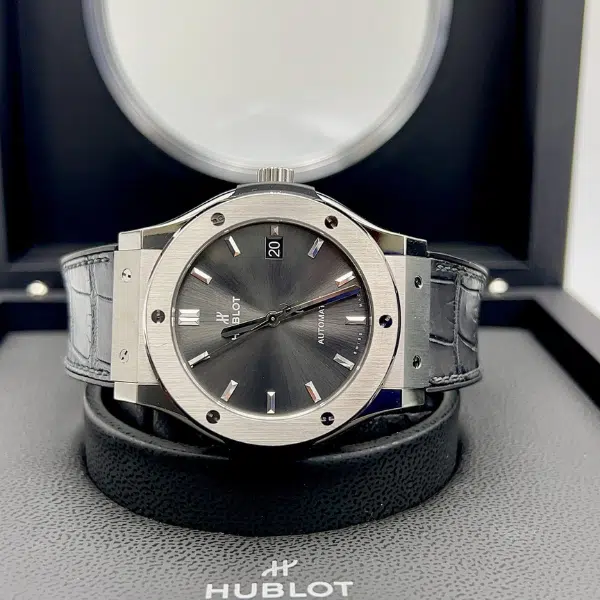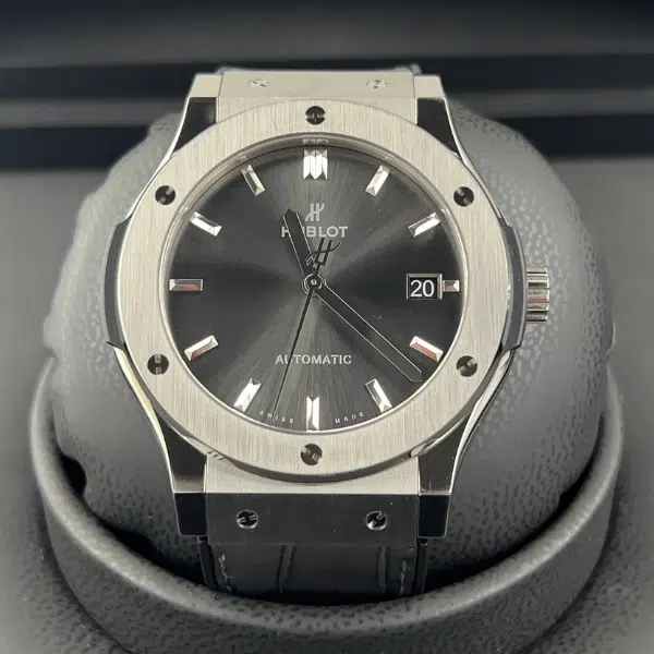 This pre-owned Hublot Classic Fusion, reference 511.NX.7071.LR features a 42mm case crafted from satin-finished titanium, offering durability with a lightweight profile. The grey sunray dial is sleek and understated, complemented by polished rhodium-plated hands and indices. A self-winding automatic movement beats at the heart of this watch, delivering dependable performance while subtly showcasing Hublot’s technical prowess.