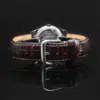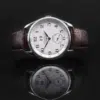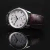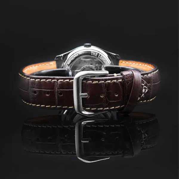 Case: Stainless Steel, 40mm Crystal: Scratch Resistant Sapphire Bezel: Fixed, Stainless Steel Dial: Silver textured Dial with Painted Black Arabic Numerals and Navy Blue Hands Case: Stainless Steel with Transparent Back Movement: Automatic Features: Date Window Strap: Black Leather with Steel Buckle