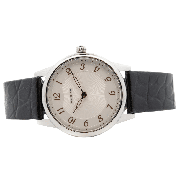 Inside beats the Montblanc MB 21.17 quartz movement, chosen for its precision, reliability, and low-maintenance appeal—ideal for wearers who value effortless luxury. The slim case profile, measuring approximately 6.5mm, allows the watch to slip seamlessly under a cuff, making it equally suited to professional environments and evening occasions. A black leather strap completes the look, adding warmth and timeless contrast.