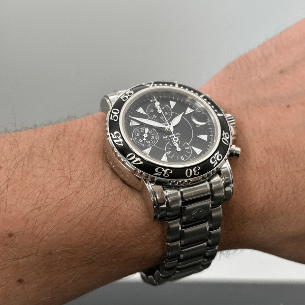 The Montblanc Sport Meisterstück XL 7034 features a well-proportioned 41mm stainless steel case, delivering a strong yet understated wrist presence suitable for daily corporate wear. Its black dial offers clean legibility and timeless appeal, paired seamlessly with a matching stainless steel bracelet that transitions effortlessly from boardroom to evening engagements. This is a watch designed to complement a tailored suit as naturally as it does a smart-casual look.