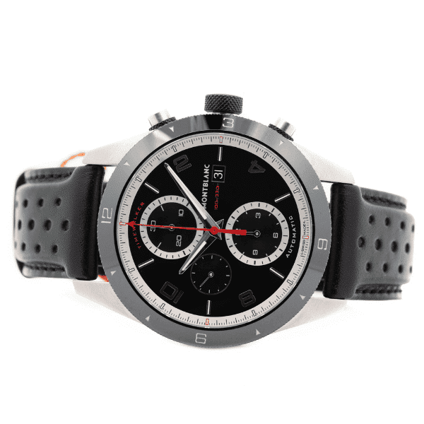 The Montblanc TimeWalker Chrono 116098 features a robust 43mm stainless steel case, black ceramic bezel with a knurled edge, and a bold black dial accented by silvery-white subdials and striking red highlights. Powered by the Montblanc calibre MB 25.07 automatic chronograph movement, it offers exceptional precision with chronograph subdials at 12 and 6 o’clock, small seconds at 9, and a red-tipped Minerva-arrow central seconds hand that pays tribute to the brand’s storied watchmaking legacy. The leather strap, perforated to evoke vintage racing gloves, combines comfort with sporty elegance. With 100m water resistance, Super-LumiNova® hands and markers, and a triple-folding clasp, it’s built for confident wear on any occasion.