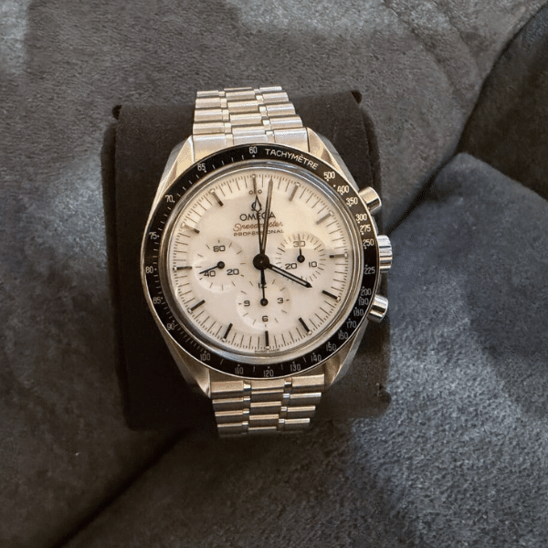 The Omega Moonwatch Professional 310.30.42.50.04.001 features a 42mm stainless-steel case, a striking white lacquered step dial, and the legendary asymmetrical Moonwatch case design inspired by the fourth-generation Speedmasters worn on the moon. This modern reference is powered by the manual-wind Omega Co-Axial Master Chronometer Calibre 3861, delivering superior precision, a 50-hour power reserve, and resistance to magnetic fields up to 15,000 gauss—perfectly suited for today’s tech-driven collector.