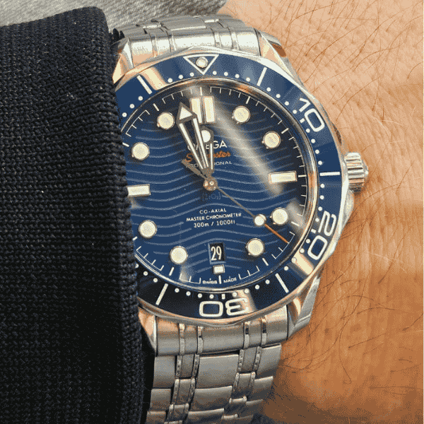 This pre-owned Omega Seamaster Diver 300M 210.30.42.20.03.001 features a 42mm stainless steel case with a rich blue ceramic bezel and matching wave-pattern dial — a signature design that pays homage to Omega’s nautical heritage. Inside beats the Co-Axial Master Chronometer Calibre 8800, officially certified for superior accuracy and magnetic resistance up to 15,000 gauss. The transparent caseback reveals the beautifully decorated movement, a subtle reminder of Omega’s technical mastery. Its helium escape valve, 300-meter water resistance, and polished steel bracelet make it as functional underwater as it is elegant above.