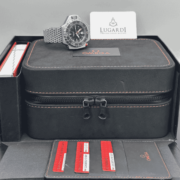 This pre-owned Omega Seamaster PloProf 1200M boasts a striking 55 x 48 mm stainless steel case paired with Omega’s “Sharkproof” bracelet, a design as formidable as its name. The black bi-directional sapphire bezel with Super-LumiNova markers ensures perfect underwater readability, while the signature orange bezel security pusherreinforces its professional-grade engineering. Its black dial, framed by a sapphire crystal, features luminous hands and markers and a discreet date display between 4 and 5 o’clock — maintaining legibility in any light.