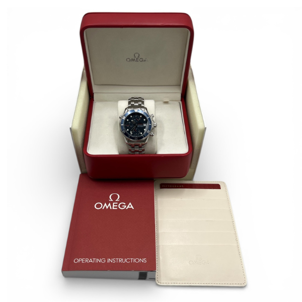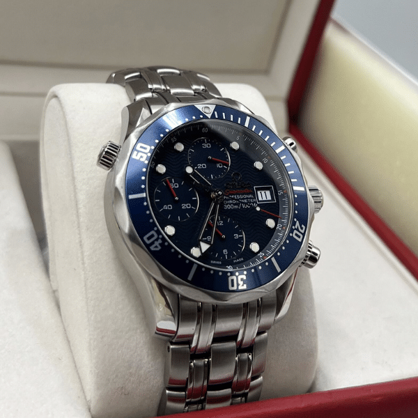 Inside beats a dependable automatic chronograph movement, celebrated for its accuracy and robustness. With 300 metres of water resistance, a screw-down crown, and a solid case construction, this Seamaster remains a genuine tool watch—built to perform, not just impress.