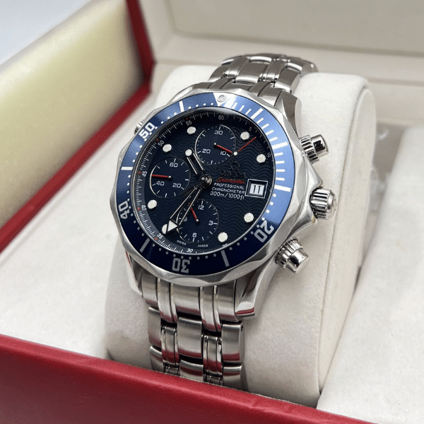 The signature blue wave-pattern dial is instantly recognisable, offering strong visual depth and excellent legibility. Luminous hands and markers ensure clarity in low-light and underwater environments, while the chronograph sub-dials add technical interest without overwhelming the design. Protected by a sapphire crystal, the dial maintains its sharp appearance and durability over time.