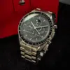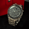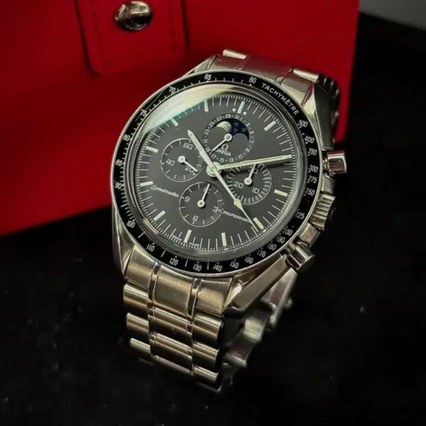 This pre-owned Omega Speedmaster Professional “Moonphase”, reference 3576.50.00, features a 42mm stainless steel case and the hallmark black dial that defines the Moonwatch lineage. What sets this model apart is the moonphase and date subdial—a celestial addition that enhances the iconic chronograph design with artistic depth. The luminous markers and hands ensure excellent legibility, while the Hesalite crystal maintains the vintage look that collectors admire.