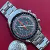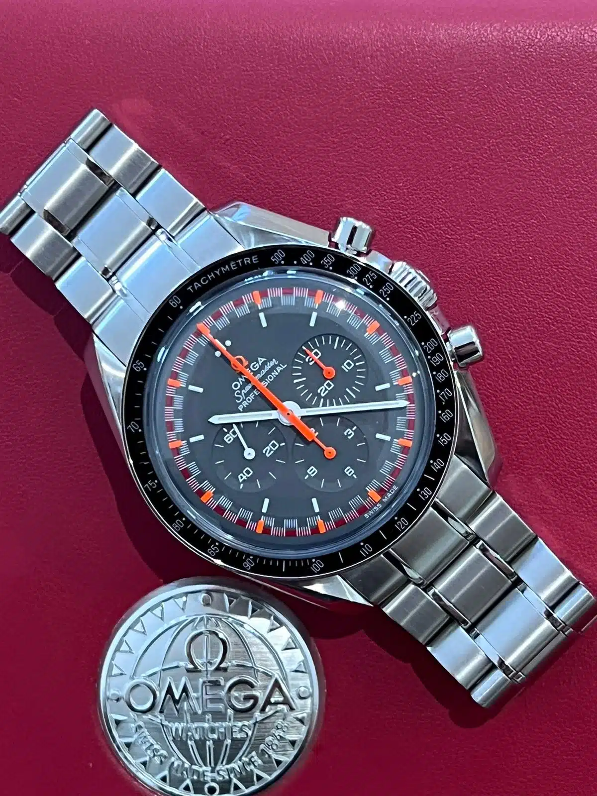 Its 42mm stainless steel case houses a bold black dial accented with vibrant orange chronograph hands, Omega logo, and hour markers, inspired by the classic Speedmaster Mark II Racing. The outer minute track features a red-and-white “racing” pattern with five tick marks between each minute, allowing for precise timing down to the second. Beneath the hesalite crystal beats the manual-wind Omega calibre 861, a movement revered for its proven reliability and precision, echoing the Speedmaster’s long-standing professional chronograph heritage.