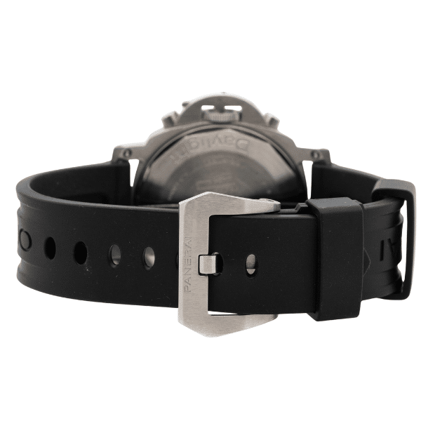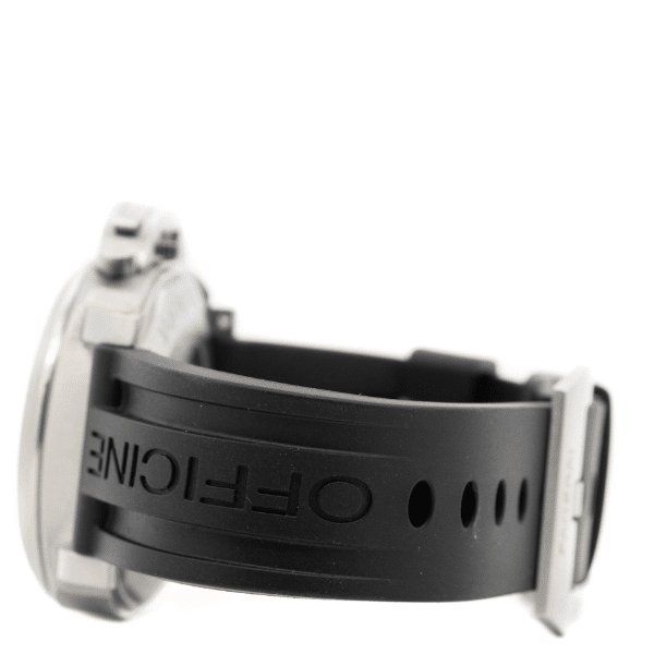 The black dial features a tri-compax chronograph layout, offering excellent legibility and visual balance. Large luminous markers and hands ensure instant readability, staying true to Panerai’s tool-watch origins. Flanked by chronograph pushers on either side of the crown guard, the design is both functional and visually striking. Paired with a black rubber strap, the watch maintains a rugged, modern edge while remaining comfortable for daily wear.