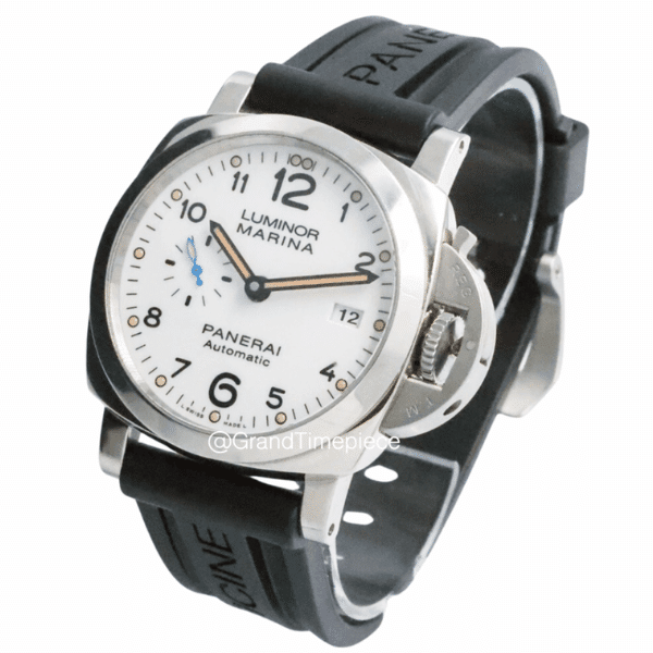 The crisp white dial provides striking contrast against the black rubber strap, enhancing legibility and visual impact. Luminous Arabic numerals and hands ensure excellent readability in low-light environments, while the date display at 3 o’clock and small seconds subdial at 9 o’clock add functional balance. A scratch-resistant sapphire crystal protects the dial, reinforcing the watch’s durability for everyday wear.