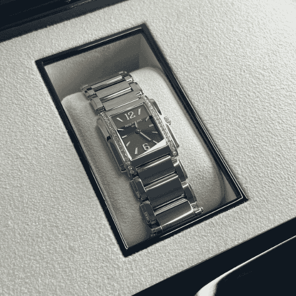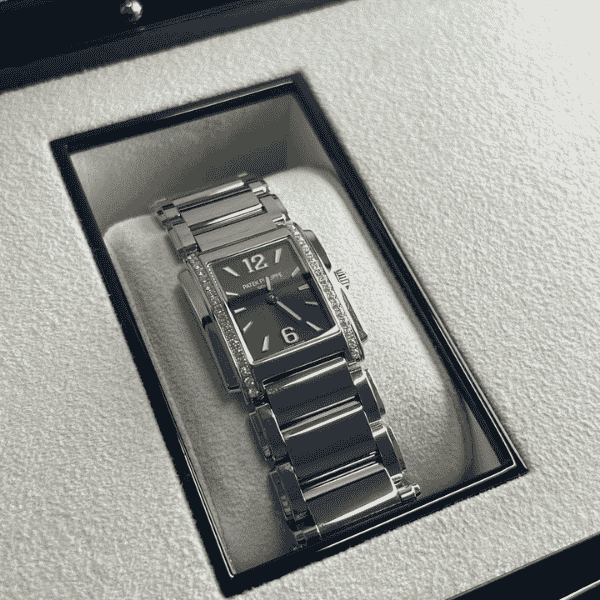 At its heart beats a precise Swiss quartz movement, ensuring accuracy and effortless functionality — true to the Patek Philippe standard of excellence. The integrated stainless-steel bracelet flows seamlessly into the curved case, enhancing both comfort and aesthetic continuity. A sapphire crystal protects the dial, preserving its artistry for years to come.