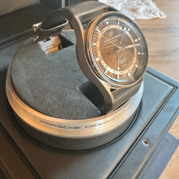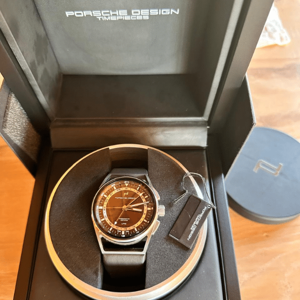 The brown dial offers excellent legibility, enhanced by a subtle day/night indicator at 9 o’clock, while the date automatically adapts as time zones change. This thoughtful design eliminates unnecessary complexity, aligning perfectly with Porsche Design’s functional, performance-driven aesthetic. The watch is paired with a genuine Porsche vehicle leather strap, reinforcing its motorsport DNA and refined durability.