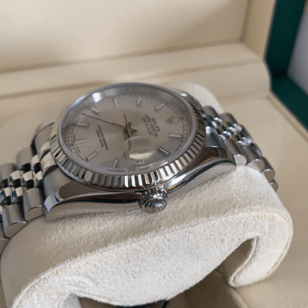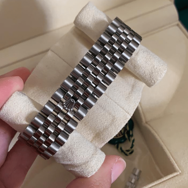 The silver dial is clean, elegant, and immediately recognisable, accented by Roman numeral hour markers that enhance its classic appeal. A date window at 3 o’clock, complete with Rolex’s renowned cyclops magnification, reinforces the Datejust’s reputation for practicality without sacrificing sophistication. With 100 metres of water resistance, this watch transitions effortlessly from formal environments to relaxed weekends.