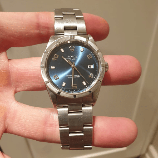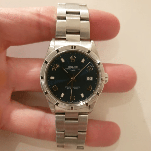 The blue dial is clean and instantly recognizable, anchored by Rolex’s signature date window and protected by the robust Oyster case construction. Unlike the fluted bezel seen on Datejust models, the engine-turned bezel of the 15210 offers a subtle yet distinctive aesthetic—one that seasoned collectors appreciate for its rarity and character. This detail alone sets the watch apart within the Rolex catalogue.