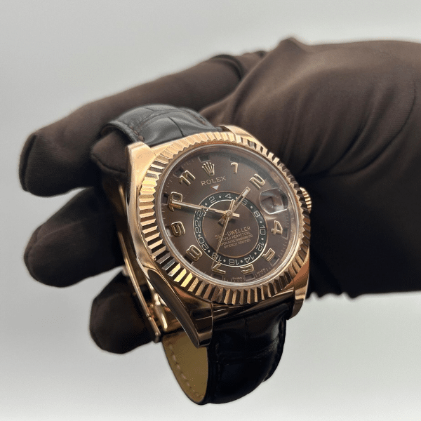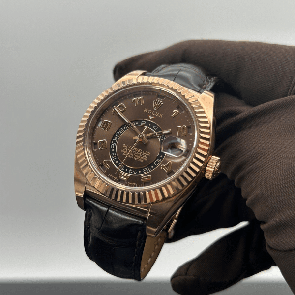 The Rolex Sky-Dweller 326135 represents the first generation of this prestigious collection, produced between 2012 and 2020 and reserved exclusively for precious metals. This reference is crafted in 18k Everose gold and paired with a rich brown alligator leather strap, offering a refined alternative to full-gold bracelet models while retaining its unmistakable status appeal. Its 42mm case strikes a confident balance between presence and elegance, making it equally at home in boardrooms, private lounges, and international terminals.