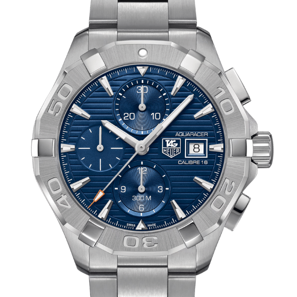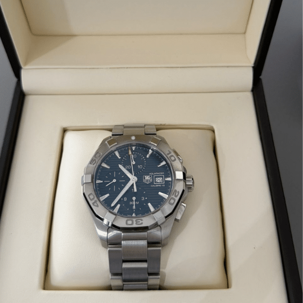 The TAG Heuer Aquaracer CAY2112.BA0927 features a robust 43mm stainless steel case, engineered to withstand the demands of diving, sailing, and everyday wear. Its rich blue dial is framed by a unidirectional stainless steel bezel and protected by a scratch-resistant sapphire crystal, delivering both visual impact and real-world durability. Three chronograph sub-dials, a clear date window, and luminescent hands and hour markers ensure excellent legibility in all conditions.