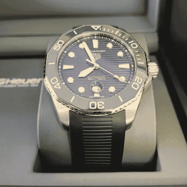 The pre-owned TAG Heuer Aquaracer Professional 300 Date WBP201B.FT6198 represents the perfect balance between luxury style and sporting capability, crafted for the ambitious professional who demands more from their timepiece. Re-launched in 2021, the Aquaracer line pushes the limits of dive watch design, and this model is no exception. Its 43mm stainless steel case showcases crisp, angular lines, while the bold blue dial with its wave-pattern finish reflects TAG Heuer’s maritime heritage. The unidirectional ceramic bezel not only adds durability but also enhances functionality for timing dives or daily adventures.