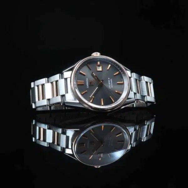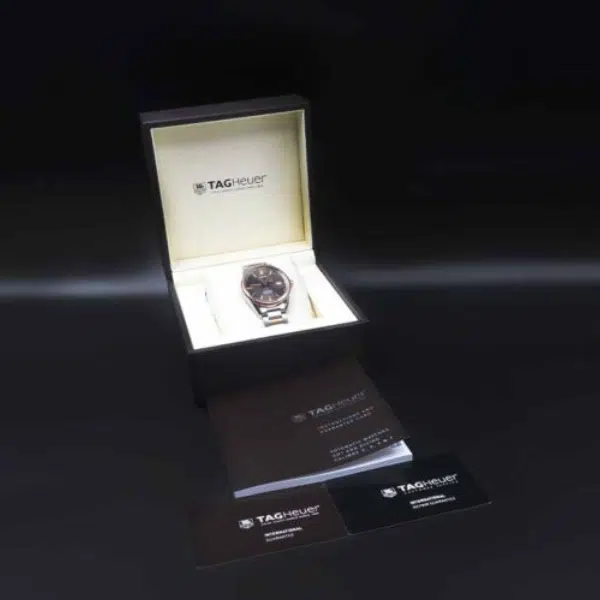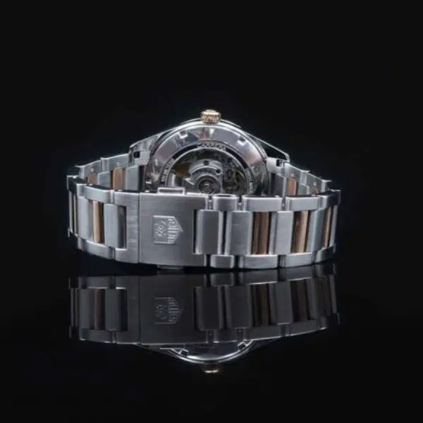 Encased in a stainless steel 39mm case, the watch is both durable and stylish, making it suitable for everyday wear and formal occasions alike. The smooth fixed bezel, crafted from 18ct rose gold, enhances the watch’s luxurious appeal, complementing the two-tone aesthetic. A scratch-resistant sapphire crystal with an anti-reflective coating ensures lasting clarity and protection. At the heart of this timepiece is the TAG Heuer Calibre 5 automatic movement, delivering reliable precision and a 38-hour power reserve. The transparent sapphire case back offers a glimpse into the intricate mechanics of the self-winding movement. Completing the look is a two-tone stainless steel and rose gold bracelet, providing versatility and elegance.