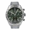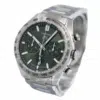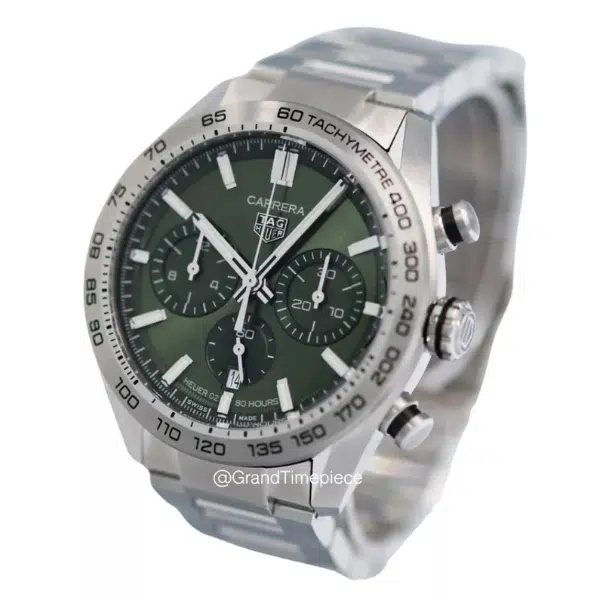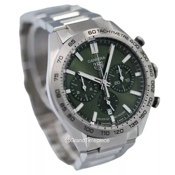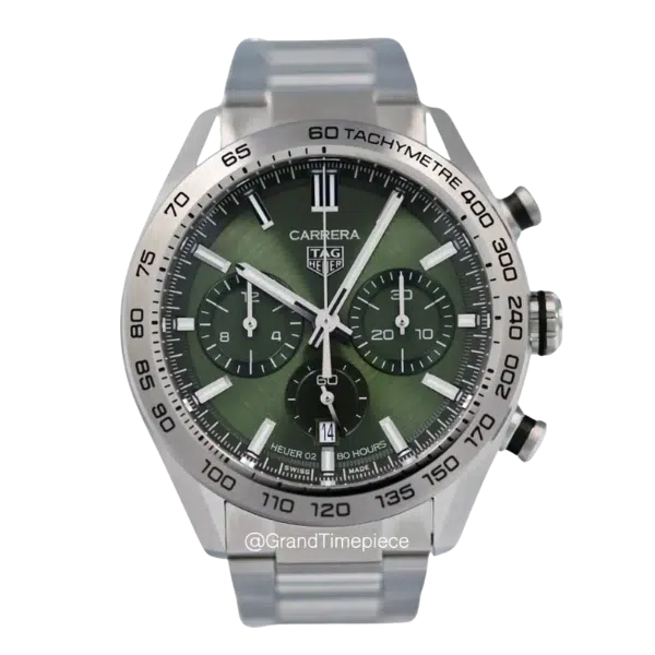 This unworn chronograph features a 44mm stainless steel case with a fixed bezel and a finely brushed finish that enhances its bold yet refined look. The green sunray-brushed dial is detailed with luminescent baton hour markers, two chronograph subdials, and a discreet date window at 6 o’clock, all protected by a durable sapphire crystal. The chronograph functionality is powered by TAG Heuer’s in-house Calibre Heuer 02 automatic movement, which offers an 80-hour power reserve—ideal for daily use or extended wear between windings.