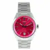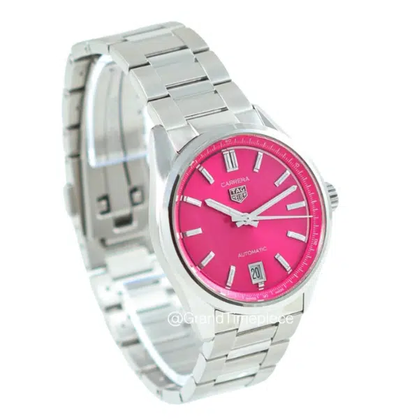 This pre-owned TAG Heuer Carrera features a 36mm stainless steel case with a polished bezel that enhances its timeless silhouette. The vivid pink dial is adorned with silver-tone baton hour markers and sleek hands, delivering legibility without compromising aesthetics. A discreet date window at 6 o’clock adds functionality while maintaining a clean, modern look.