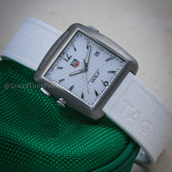 At its core, the watch is powered by a precise quartz movement, offering dependable, low-maintenance timekeeping—ideal for those who want reliability without the rituals of mechanical winding. The solid titanium case back is engraved with the signature of Tiger Woods, adding a subtle but meaningful connection to golf heritage and TAG Heuer’s sporting legacy.