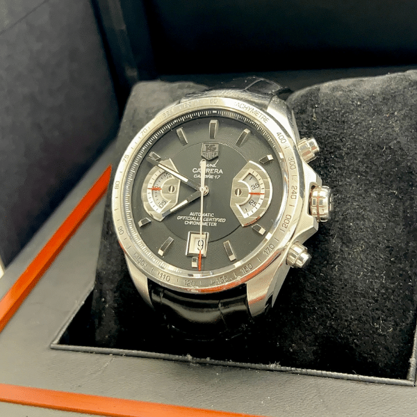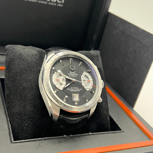 The TAG Heuer Grand Carrera CAV511A pre-owned chronograph draws directly from the brand’s deep-rooted motorsport heritage, tracing its lineage back to the iconic Carrera Panamericana road race. Designed for performance-minded professionals, this model delivers a powerful on-wrist presence with its 43mm stainless steel case, bold black dial, and sporty chronograph layout. It’s a watch that speaks to ambition, speed, and mechanical confidence.