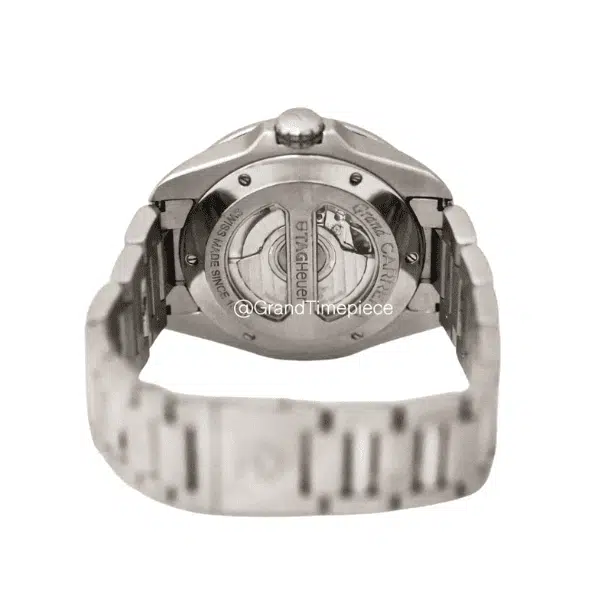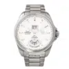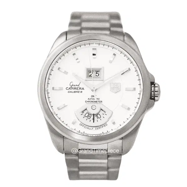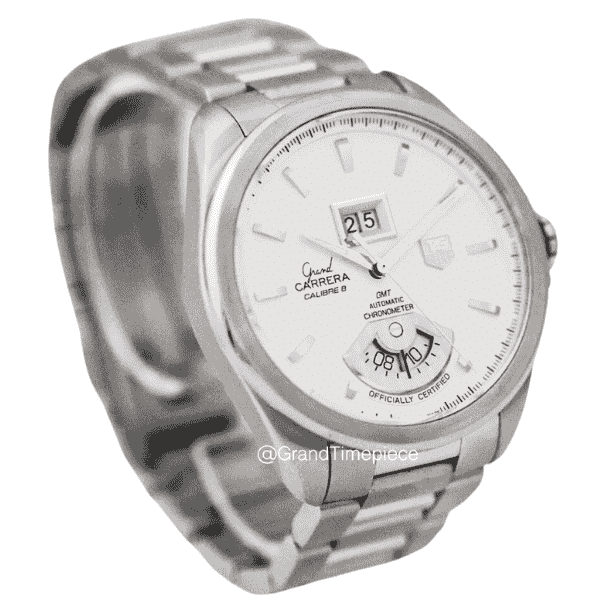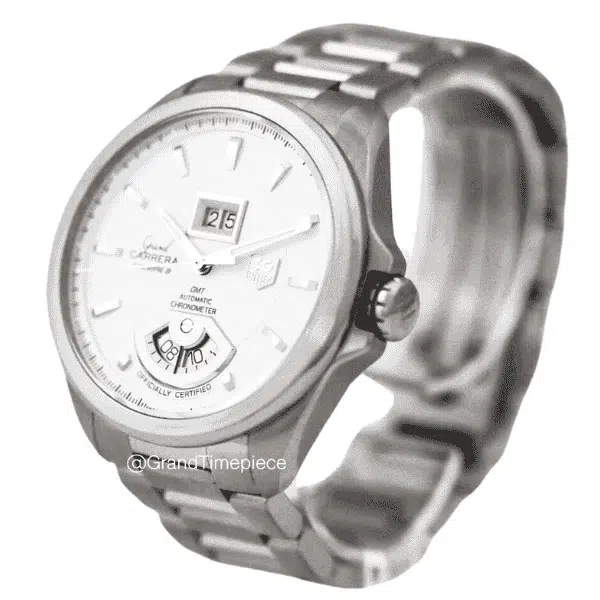 This pre-owned TAG Heuer Grand Carrera is presented in mint condition with minimal signs of wear, fully inspected, and authentication certified for your assurance. Its polished 42.5mm stainless steel case sits comfortably on the wrist, complemented by a robust steel bracelet that balances durability with sophistication. The white dial stands out with luminous hands and hour markers for excellent readability, while the date display at 12 o’clock and the GMT function at 6 o’clock add practical functionality—perfect for frequent travelers or professionals managing multiple time zones.