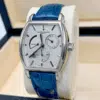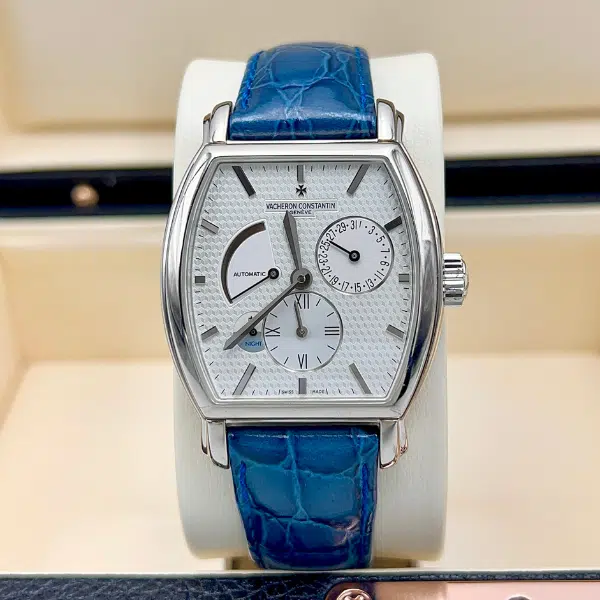This pre-owned Vacheron Constantin Malte Tonneau Dual Time features a 35.5mm case in solid 18kt white gold, a hallmark of timeless elegance. Its silver guilloché dial presents a harmonious layout of complications, including a second time zone sub-dial with day/night indicator at 6 o’clock, a date register at 3, and a power reserve indicator at 9. Slender white gold hands and index hour markers enhance the understated beauty, while the automatic movement ensures enduring performance and reliability.