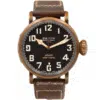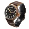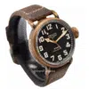 Secured to the wrist by a rich brown calf leather strap, the watch is fastened with a bronze tang buckle, ensuring a comfortable fit while maintaining the cohesive bronze theme. The black dial serves as a bold backdrop for oversized Arabic numerals, which are not only visually impactful but also highly functional, allowing for easy readability. The hands and numerals are coated with gold-plated SuperLumiNova®, providing excellent visibility in low-light conditions.