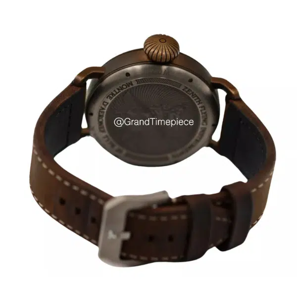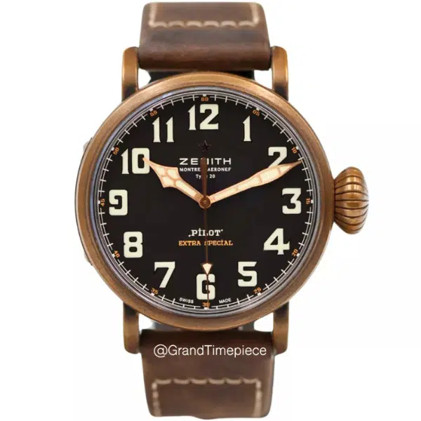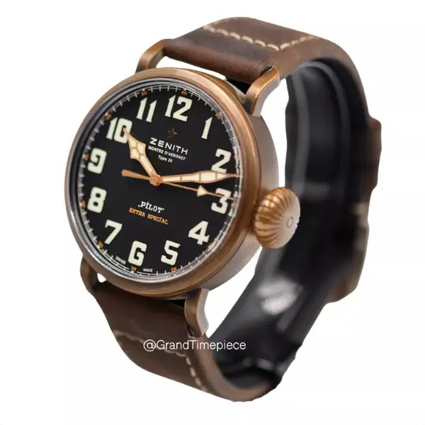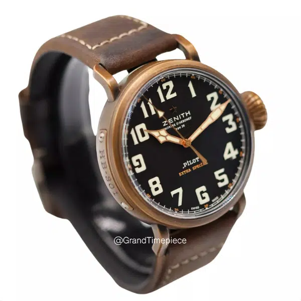 The Zenith Pilot model 29.2430.679/21.C753 is a striking timepiece that seamlessly blends modern aesthetics with classic materials. The watch features a robust 45mm round case crafted from bronze, lending it a distinctive look that will develop a unique patina over time. This case is complemented by a fixed bronze bezel, further enhancing its rugged elegance.