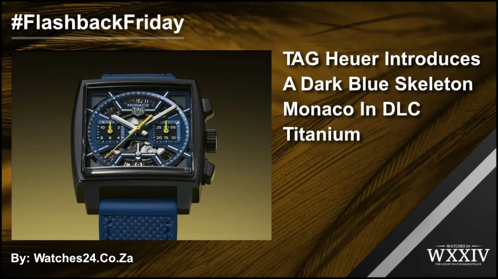 The new Monaco features a dark blue, skeletonised dial and a black DLC-coated grade-2 titanium case, measuring 39mm wide and 47mm lug-to-lug. Yellow accents add a touch of colour. The dial is sandblasted blue with extensive skeletonisation, revealing the Heuer calibre 02 chronograph beneath. It is paired with a sporty blue calfskin and leather strap.
