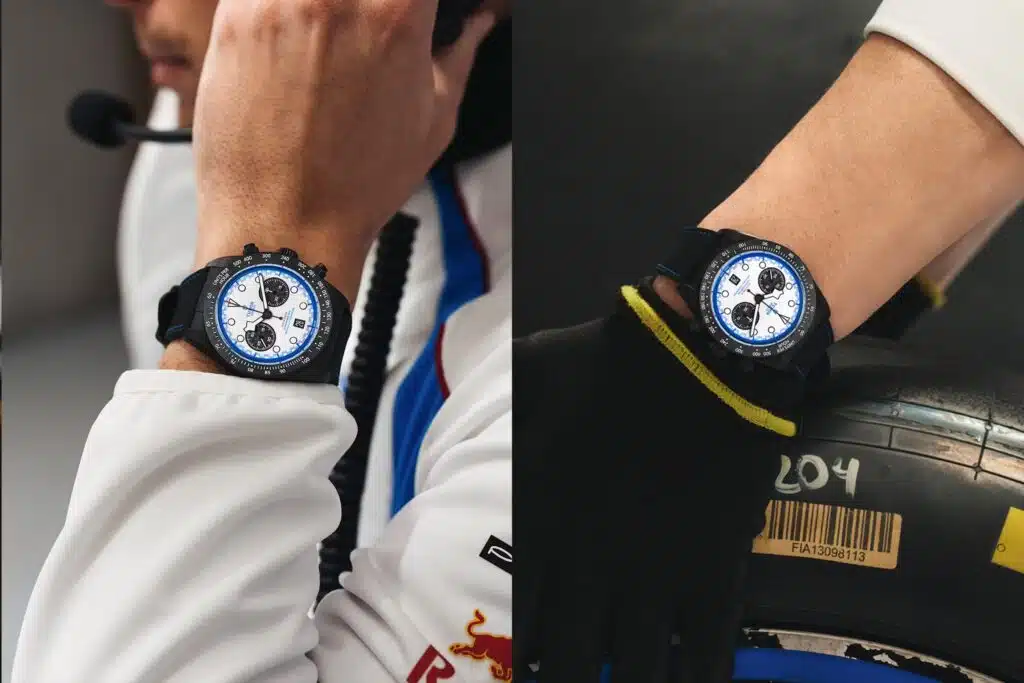 Carbon-pattern subdials reinforce the thematic connection to motorsports, while the domed dial offers enhanced legibility through a sapphire crystal. The color scheme—white and blue—echoes the livery of the VCARB Formula 1 team, further aligning the timepiece with the spirit of competitive racing.
